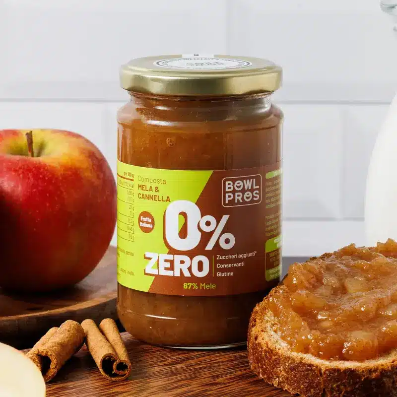 La Composta Mela e Cannella ZERO Bowlpros unisce la freschezza croccante delle mele italiane alla nota calda e avvolgente della cannella, con una dolcezza naturale data dall’inulina di cicoria, una fibra vegetale priva di zuccheri e calorie.