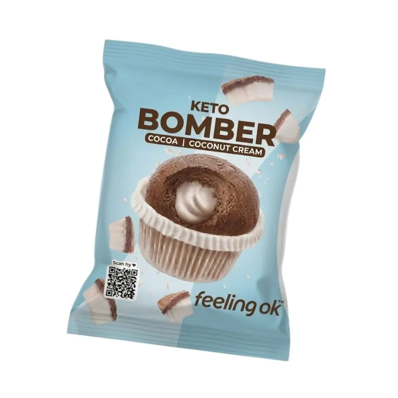 Il Feeling OK Bomber Muffin Ripieno Cocco è un muffin keto a basso contenuto di carboidrati con impasto al cacao e cuore morbido di crema al cocco, pensato per chi segue una dieta chetogenica e cerca un dolce alternativo al classico cioccolato. Fa parte della nuova linea Bomber Feeling OK, i primi muffin ripieni del marchio. L’abbinamento cacao-cocco offre una nota tropicale e cremosa, ideale per chi vuole variare i gusti senza rinunciare al piacere di una colazione golosa. È indicato come prima colazione, merenda o spuntino dolce in un piano alimentare low carb.