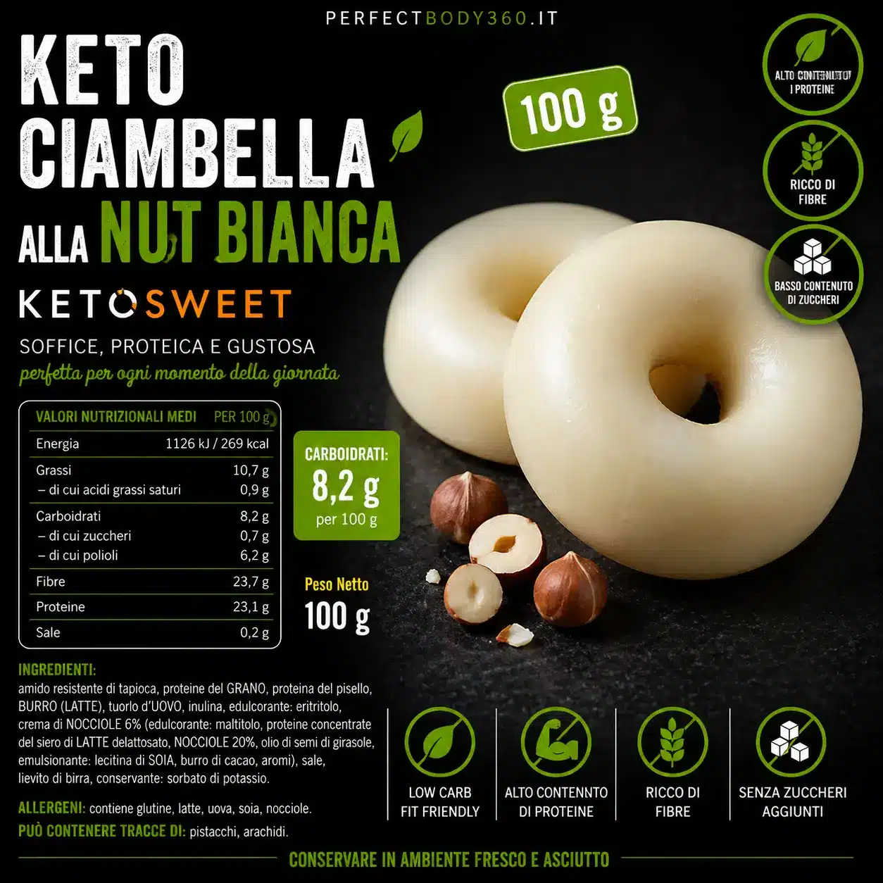 INGREDIENTI: amido resistente di tapioca, proteine del GRANO, proteina del pisello, BURRO (LATTE), tuorlo d’UOVO, inulina, edulcorante: eritritolo, crema di NOCCIOLE 6% (edulcorante: maltitolo, proteine concentrate del siero di LATTE delattosato, NOCCIOLE 20%, olio di semi di girasole, emulsionante: lecitina di SOIA, burro di cacao, aromi), sale, lievito di birra, conservante: sorbato di potassio.