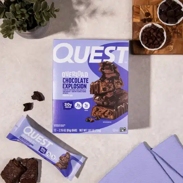 Ignora gli snack più semplici con i trucchi proteici. Le nuove barrette proteiche Quest™ Overload sono ricoperte, deliziosamente glassate e ricche di pezzetti, gocce e pezzi di cioccolato che ami, mantenendo lo zucchero nella tua dieta. Il nostro nuovo gusto Chocolate Explosion è ricco di ingredienti straordinari come gocce di cioccolato fondente, gocce e pezzi di cioccolato al latte e pezzi di biscotto al cioccolato in una base fondente al gusto di cioccolato. Il tutto è poi guarnito con una copertura di cioccolato al latte e granella di cioccolato su una glassa di cioccolato al latte.