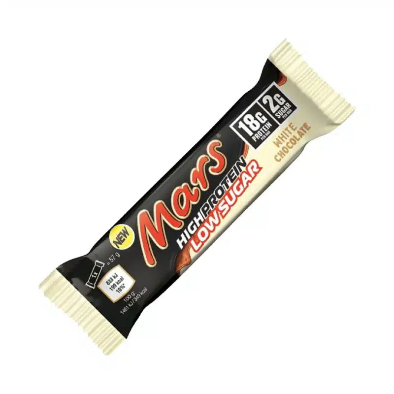 Mars Low Sugar HiProtein Bar White Chocolate è una famosa barretta proteica che ha l’aspetto e il sapore della classica barretta Mars, ma contiene fino a 18 g di proteine e ha un contenuto significativamente ridotto di carboidrati, zuccheri e grassi. Questa edizione speciale ha solo 201 calorie. Non diminuisce in alcun modo il gusto: si tratta sempre di una deliziosa barretta ricoperta di cioccolato bianco, praticamente indistinguibile dalla classica barretta Mars.