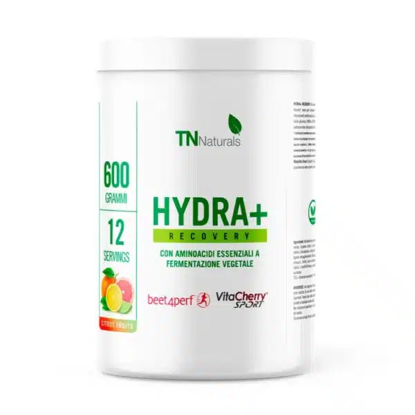 HYDRA+ Recovery contiene una miscela di carboidrati ad alto indice glicemico, ideali per ripristinare le scorte di glicogeno muscolare dopo un’intensa attività fisica; un insieme di aminoacidi essenziali (EAA) a fermentazione vegetale con un elevato tenore di L-Leucina, la loro azione favorisce il recupero riducendo l’indolenzimento, il danno muscolare e il senso di fatica; la presenza di L-Leucina in dosi maggiori favorisce il trasporto di nutrienti e la sintesi di proteine a livello muscolare, ottimizzando in maniera significativa i tempi di recupero dell’atleta; creatina citrato, sostanza ideale per elevare non solo il livello della prestazione fisica ma anche e soprattutto il recupero, la creatina promuove la risposta muscolare durante la pratica sportiva e riduce la fatica, i dolori muscolari e la produzione di radicali liberi derivanti dalle reazioni metaboliche durante lo stress fisico; Magnesio e Potassio, elettroliti fondamentali per l’organismo che favoriscono il recupero muscolare e riducono stanchezza e affaticamento; L-Alanil-L-Glutammina, ideale per gli atleti che effettuano intensi allenamenti quotidiani grazie ai suoi effetti positivi in fase di recupero post workout, alla riduzione del catabolismo muscolare e del senso di fatica, in particolare dopo gli sforzi più intensi.