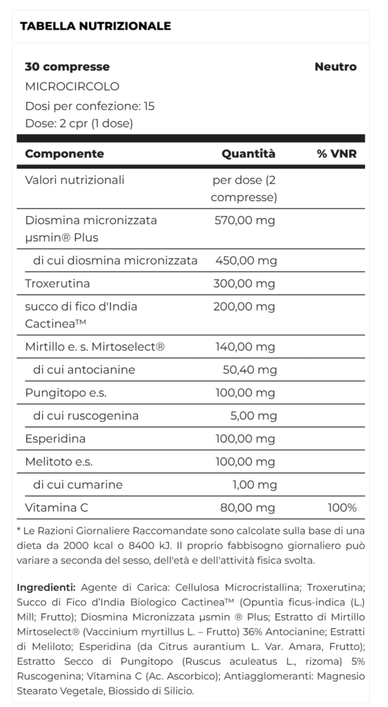 Integratore alimentare con flavonoidi, estratti naturali, vitamina C per favorire il Microcircolo.