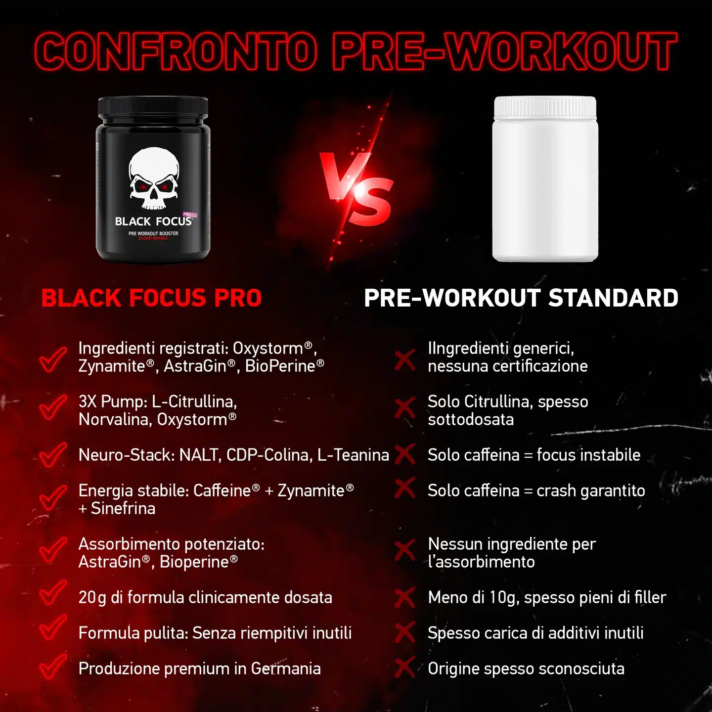 Il pre-workout più potente che puoi ottenere nell’UE. Massimizza le tue prestazioni con concentrazione estrema, potenza esplosiva e un pump devastante.