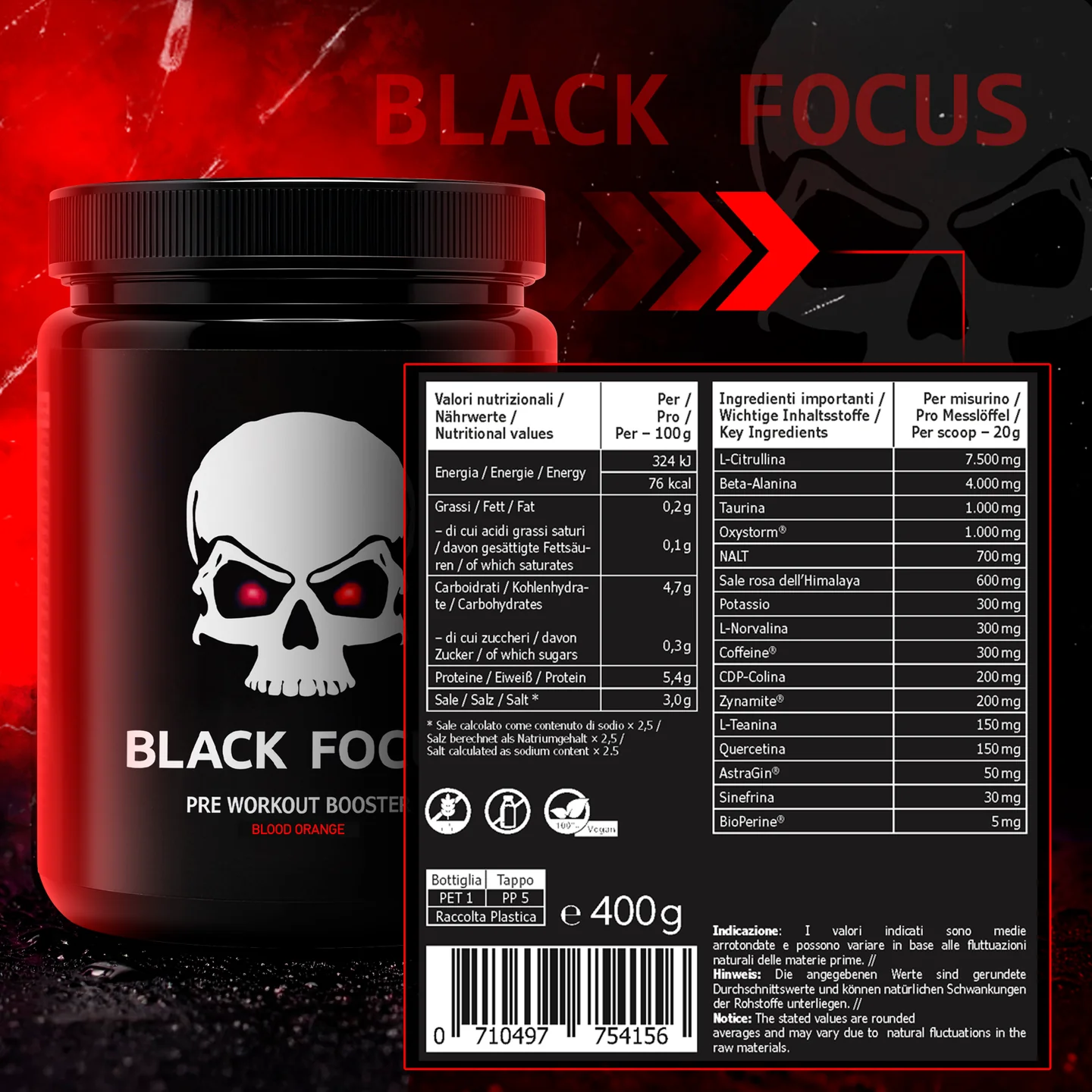 Ingredienti L-Citrullina, Beta-Alanina, Acidificante: Acido citrico; Taurina, Estratto di amaranto, N-Acetil-L-Tirosina, Sale rosa dell’Himalaya, Citrato di potassio, Estratto di arancia amara, Aroma, L-Norvalina, Caffeina naturale, Estratto di tè verde, Citicolina, Estratto di foglia di mango, Edulcoranti: Acesulfame-K, Sucralosio; Quercetina diidrato, Miscela di estratti vegetali (Estratto di Panax notoginseng, Estratto di Astragalus membranaceus), Colorante: Allura Red AC, Estratto di pepe nero