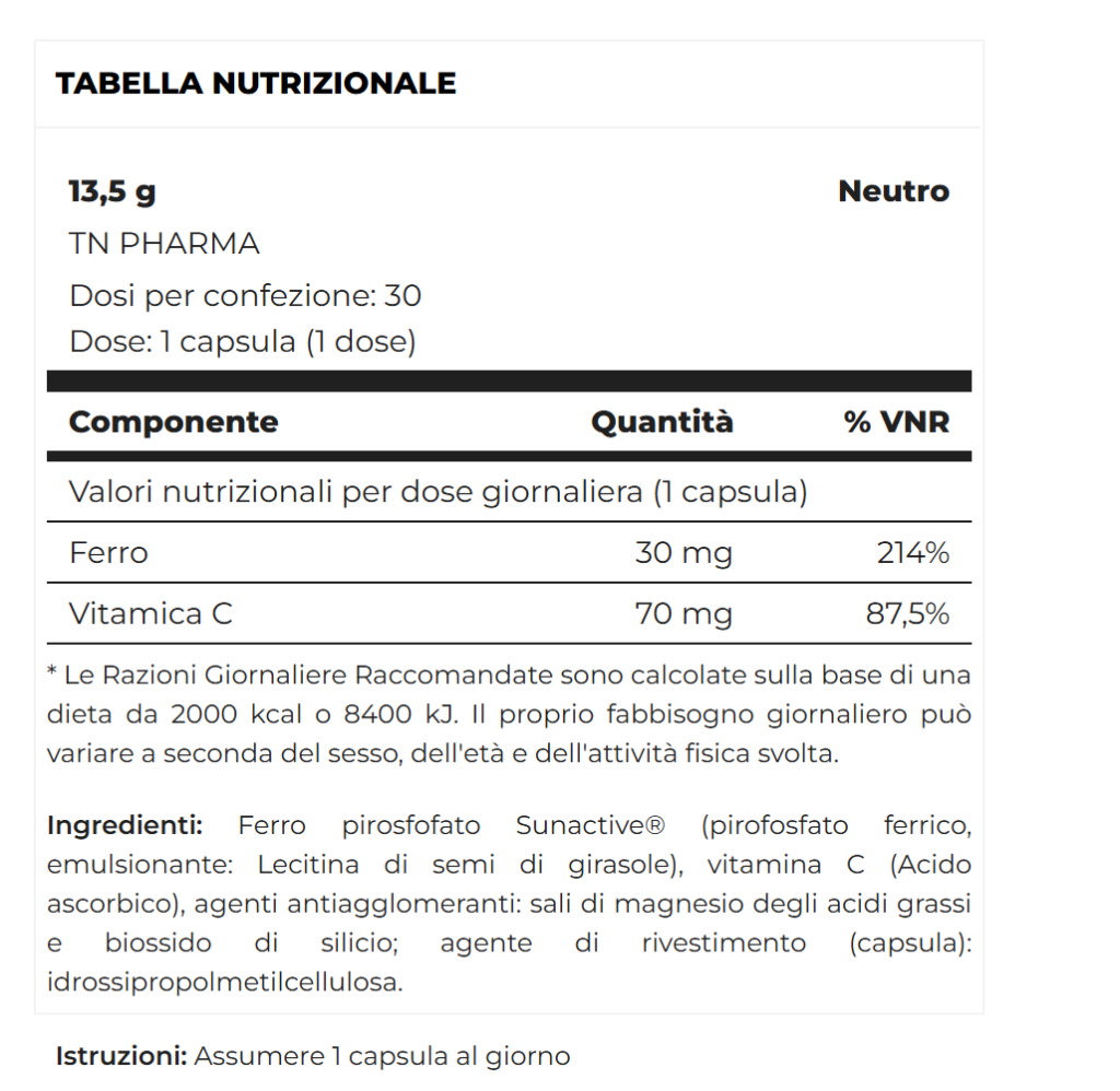 Per ovviare a questi problemi di assorbimento, TN Pharma propone Ferrofort-C 30 caps TN Pharma, un integratore alimentare innovativo a base di ferro pirofosfato microincapsulato a marchio registrato SunActive® con l’aggiunta di vitamina C, sostanza che favorisce ulteriormente l’assorbimento e la biodisponibilità di questo minerale, rendendone l’integrazione ancora più efficace.