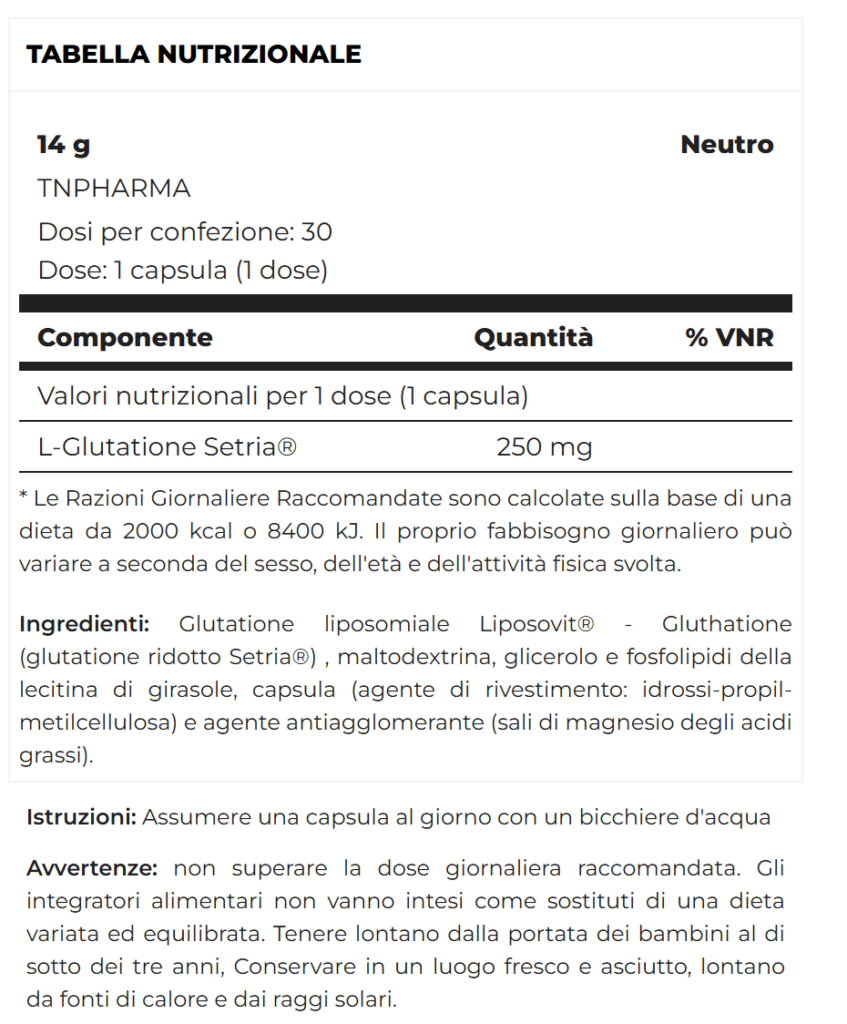 A queste caratteristiche aggiungiamo che TnPharma Glutatione Liposomiale è Vegan, Senza Glutine, Senza Lattosio.