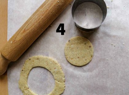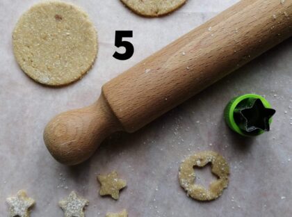 2-Stendere l’impasto a circa 2mm di spessore e ricavare con il coppapasta le 2 basi circolari e con la parte in eccesso fare delle stelline decorative. (foto 3-4-5)