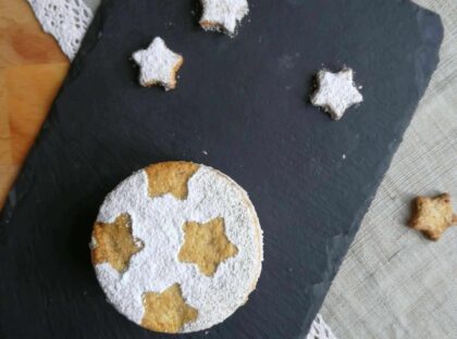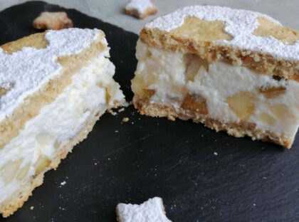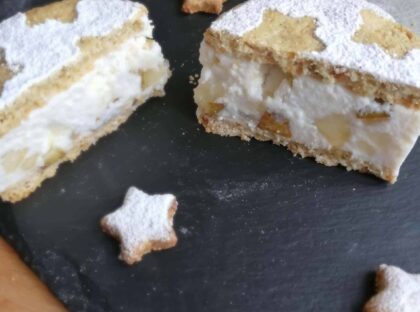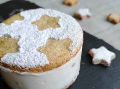 8-Trascorso il tempo in frigo togliere il coppapasta sfilandolo con attenzione. Spolverare con stevia a velo, aggiungere i biscottini a stella come decorazione.