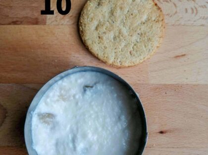 6-Assemblaggio: rivestire il fondo del coppapasta con alluminio alimentare, inserire uno dei due dischi di biscotto, proseguire versando la farcia di ricotta alla quale vanno aggiunti i dadini di pera, terminare poggiando l’altro disco e schiacciare leggermente per compattare il tutto. (foto 8-9-10-11)