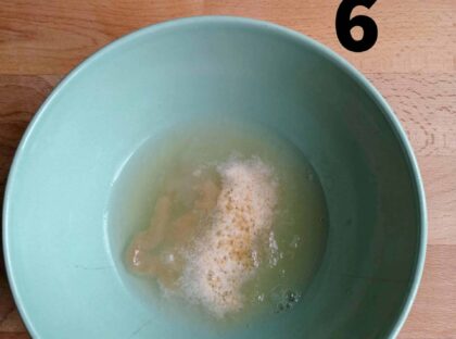 4-Nel frattempo prepariamo la farcia: in una ciotolina mettere l’albume, l’acqua,il bolero e agar agar, mescolare con una frusta e far cuocere in microonde alla massima potenza per 1′.30”. In mancanza di microonde potete far cuocere a fiamma bassa in un pentolino antiaderente fino ad addensamento. (foto 6)