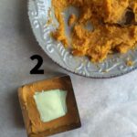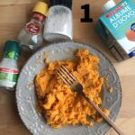 2-Togliere la buccia e schiacciare le patate con una forchetta aggiungendo le spezie, il sale e l’albume. (FOTO 1)